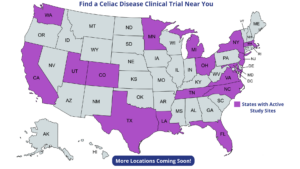 See if you may be eligible for a phase 2 celiac disease study currently enrolling. The FB102-301 study is a celiac disease clinical trial researching the effectiveness of the investigational drug FB102 at treating symptoms and intestinal damage when gluten is ingested.
